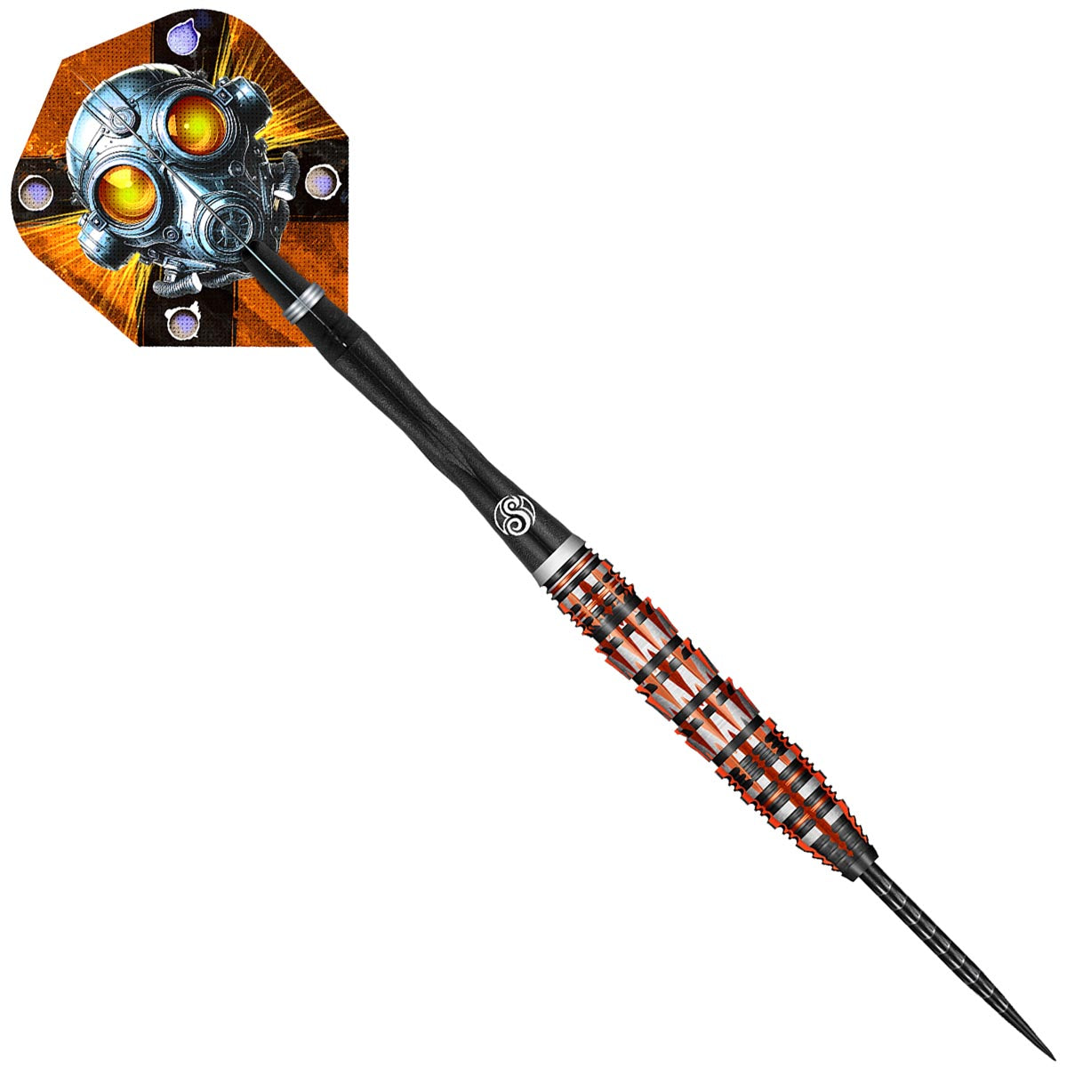 At Rustin’s barrel core - the Throttlefang Grip — built with three layers of tricky machining that fuse a sweeping shark grip with 45° axial mill cuts. Fierce push points with a clean, fast release. Up front, alternating rings with axial cuts echo the Throttlefang core, leading to a flat-top shark nose designed to reduce deflections and protect your dart flights.